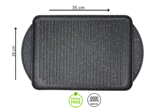La piastra a induzione in alluminio teflonato senza PFOA è la scelta perfetta per cuocere carne, pesce e verdure in modo sano e veloce. Realizzata in alluminio di alta qualità, garantisce una distribuzione uniforme del calore, permettendo di cucinare in modo rapido e preciso. La superficie teflonata, senza PFOA, assicura una cottura sana, senza rilasciare sostanze nocive e consente di cucinare con meno grassi mantenendo intatti i sapori degli ingredienti.